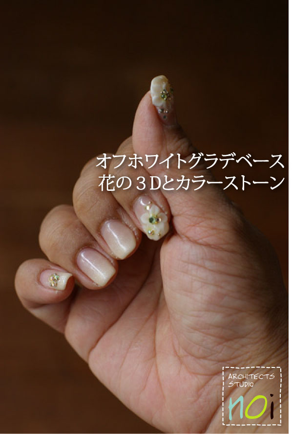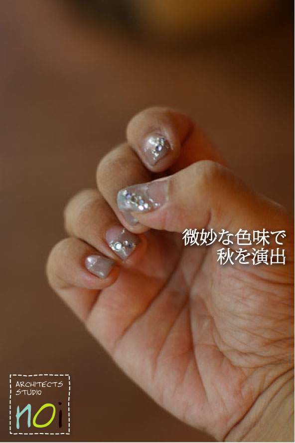 ペイント以外の指はベージュ系の逆フレンチにいくつかストーンをあしらって。