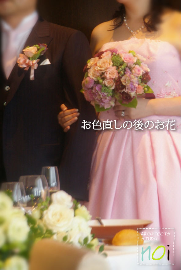 お色直し後は、可憐なピンクのドレスにあわせてちょっとクラッシックな色ブーケ。