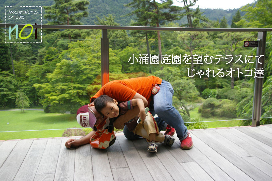 バスの時間までテラスではしゃぐオトコ達。
