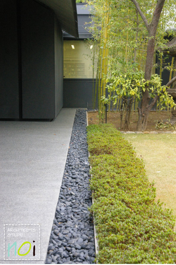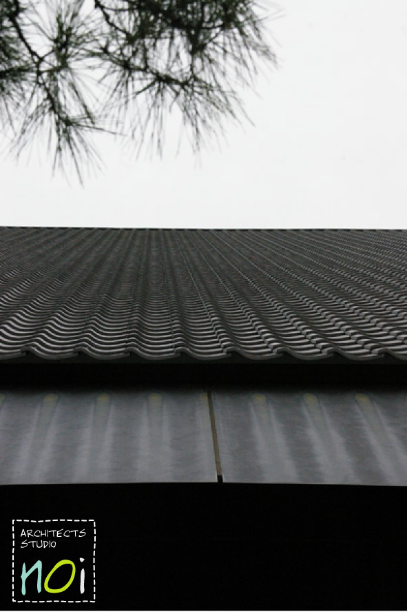 深い深い軒が低くに抑えられつつも、軽やかに仕上げられている瓦葺き屋根。