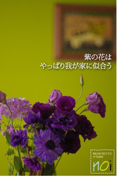 黄緑の壁には、やはり補色の紫色のお花がとっても映えます。