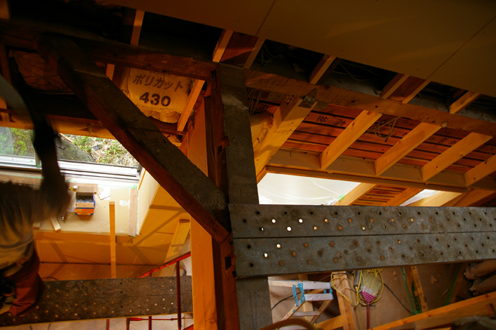 古い梁の下に大きな梁が入っています。