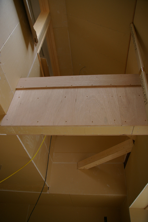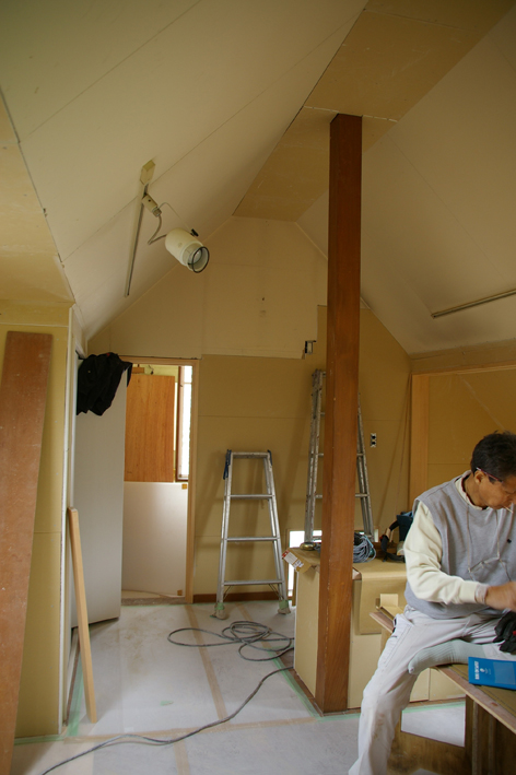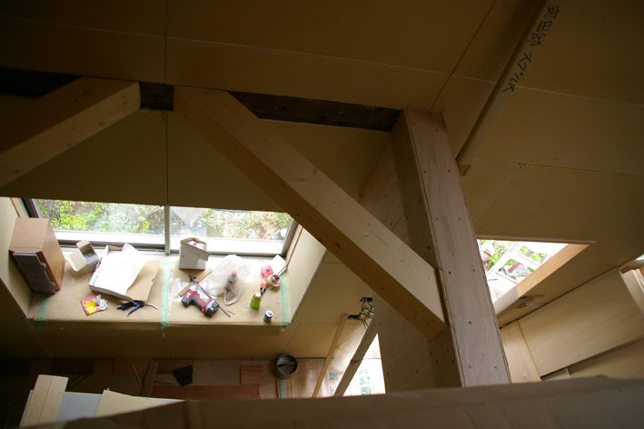 但し、一番高い部分だけは照明器具を取り付けるために平らに天井を貼りました。