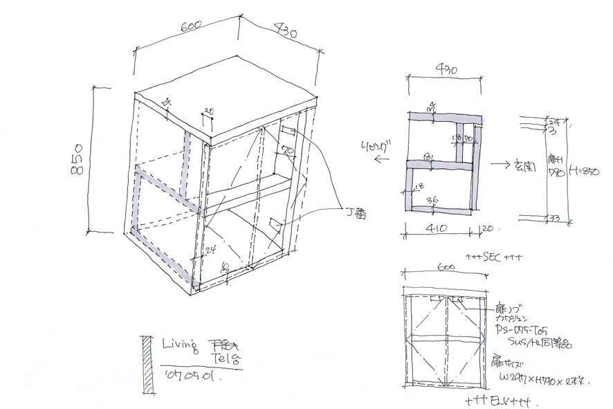 扉を入ってすぐのところに電話台兼収納。
