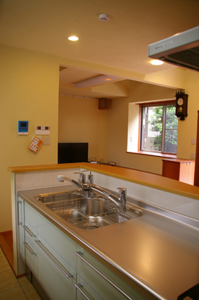対面式でリビングや庭の緑を眺めながらの調理ができる配置です。